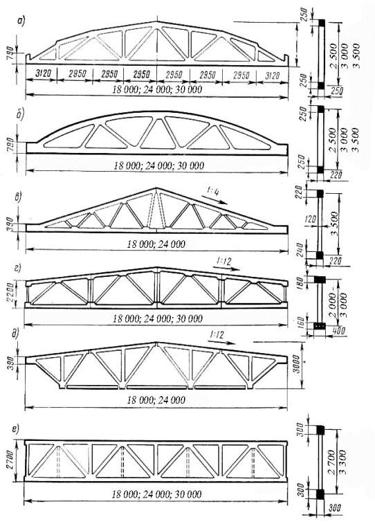 а – сегментная; б – арочная; в – треугольная; г – полигональная; д – то же, с пониженным нижним поясом; е – с параллельными поясами