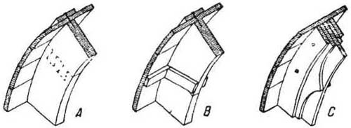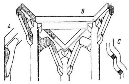 На рисунке 110, А мы видим род древесных подкосов, служащих связями. В зданиях на горе Абу (В) эти соединения принимают замысловатые изгибы, характер которых передается в детали С. Рисунок 108 А показывает конструкцию из подкосов в сочетании с кладкой горизонтальными рядами. В общем деревянные конструкции, преобладающие в индийском зодчестве, сводятся к трем следующим типам: конструкция горизонтальными рядами, укрепление углов с помощью подкосов и система арочных ферм.