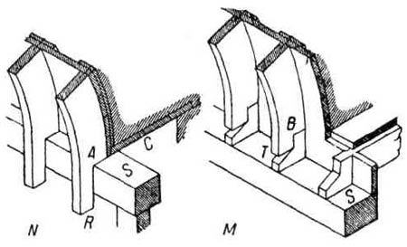 Отметим тот простой способ, при помощи которого фермы А укреплены на закладном брусе: основание каждой дуги слегка скошено, и внутренняя сторона свода дуги оказывается отклоненной к внутренней части корабля, что сокращает пролет. Конец R свешивается с закладного бруса, что дает оригинальный декоративный эффект.