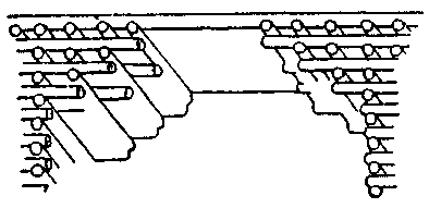 Арочные фермы — Дугообразные фермы, высеченные из камня или подвешенные к сводам пещерных храмов, бывают двух видов. Это либо подражание дощатым кружальным ребрам (рисунки 103 и 104), либо фермы, составленные из нескольких одинаковых закрепленных дуг (рисунок 105). Рисунок 103 дает изображение основных способов построения одиночных ферм.
