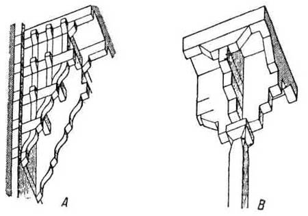 Примененная для постройки портика, она ведет к комбинациям, образующим выступы, как А или В (рисунок 108). А передает в дереве каменную конструкцию галереи в Дабхое (памятник датируется II в. н. э.). Для того, чтобы передать в дереве оригинал из камня, достаточно было восстановить переплеты с, торцы которых, впрочем, выступают достаточно ясно.