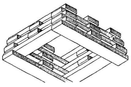 Деревянная конструкция горизонтальными рядами — Мы подошли к деревянным конструкциям, наиболее простые типы которых восходят к еще большей древности: к деревянной конструкции горизонтальными рядами, применяемой еще и в настоящее время в лесных частях Гималаев.