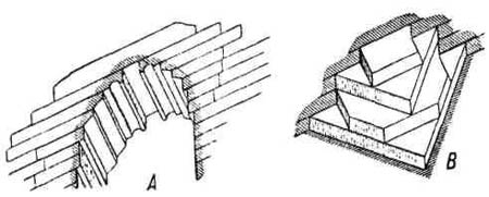Клинчатые своды, развивающие большой распор, неизвестны в индийской архитектуре. При перекрытии квадратного помещения применяется расположение плит путем так называемого напуска кассет плиты (рисунок 111, В). При перекрытии галереи применяются так называемые фальшивые своды, причем каждый камень закладывают достаточно далеко, чтобы обеспечить его равновесие (рисунки 111, Л и 112, М).