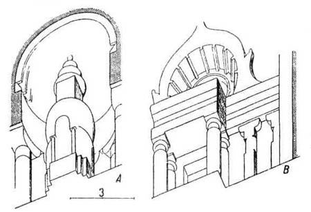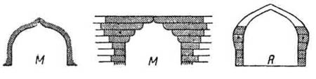 Архитектурные памятники, целиком высеченные в массиве скалы, начиная с IX в., несут многогранные купольные покрытия с профилем луковичной формы, как это показано на рисунке 112, R. Нельзя ли тут усматривать отголоски применения только что описанной системы кладки?