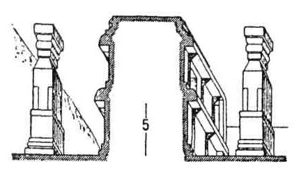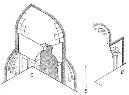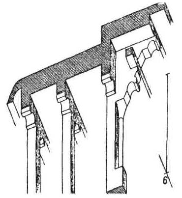 Внутри (рисунок 119, С) мы различаем то нервюры, высеченные из самой скалы, то сохранившиеся в разных местах шипы, служившие для укрепления деревянных ребер, далее — выемки, в которые были вделаны эти ребра, и связывавшие их горизонтальные брусья. В некоторых местах сохранились брусья этих деревянных декораций.