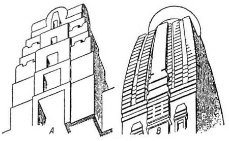 Пагода — Почти все пагоды в форме башен подходят к одному из двух типов, показанных на рисунке 120. Тип В в виде башни с выгнутыми ребрами кажется вольной передачей конструкции, описанной нами выше; тип А соответствует конструкции уступами. Пилон А происходит из Шрирангама, В — из Бхуванешвары.