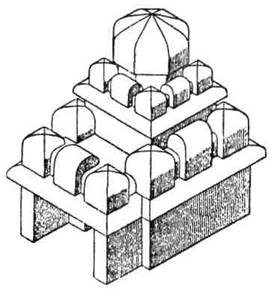 Наружная сторона покрыта выступами, образуемыми торцами досок. Этот вид купола повышенного типа с украшениями в виде рядов рюст хорошо сохранился в ряде индийских пирамид каменной кладки, между прочим, в Ориссе.