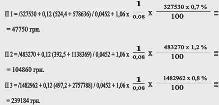 П1 = 31826 + 0,12 Х 571318 Х 1,2 = 114096 грн.