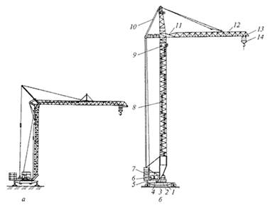 Рис. 1. Башенные краны (а - быстромонтируемый кран на винтовых опорах РБК-2-20; б - кран на рельсовом ходу КБ-504А: 1 - ходовая рама; 2 - опорно-поворотное устройство; 3 - поворотная платформа; 4 - механизм поворота; 5 - грузовая лебедка; 6 - стреловая лебедка; 7- противовес; 8 - башня; 9 - кабина; 10 - стреловой расчал; 11 - тележечная лебедка; 12 - стрела; 13 - грузовая тележка; 14 - крюковая подвеска)