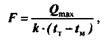 де Qmax = Qb +Q3 - максимальна годинна потреба тепла для нагріву води (Qb ) і заповнювачів (Q3 ), ккал; k- коефіцієнт теплопередачі нагрівального приладу, ккал/м2 час-град;