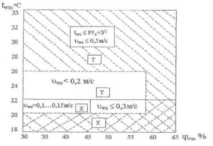 Рис.1. Області оптимальних і допустимих параметрів повітря у житлових і громадських будівлях для теплого (Т) та холодного ( X ) періодів року (заштриховано - для допустимих параметрів, не заштриховано - для оптимальних).