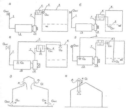 а - прямоприпливна канальна з механічним спонуканням та подачею у верхню зону приміщення; 6 -прямоприпливна канальна з механічним спонуканням та подачею повітря у робочу зону; в - припливна канальна з механічним спонуканням подачею повітря у верхню зону та відбором повітря з верхньої зони на рециркуляцію; г - те саме що й система б, але з відбором повітря на рециркуляцію з робочої зони; д - припливновитяжна загальнообмінна безканальна з природним спонуканням (аерація); е - витяжна загальнообмінна канальна з природним спонуканням; 1 – повітрозабірна шахта; 2 - припливна камера; 3 - вентилятор з електродвигуном; 4 - глушник шуму; 5 - повітророзподільник; 6 - приміщення; 7 - мережа повітропроводів; 8 – вентиляційний канал.