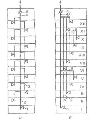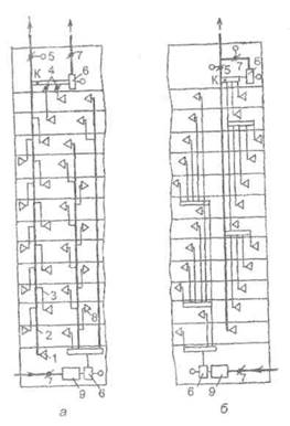 а - системи з вертикальними колекторами; б - системи з горизонтальними колекторами-збірниками; 1 - отвори на видалення повітря, 2 -вертикальний колектор; 3 - відгалуження від колектора, 4 -зворотні клапани (самозакривні); 5 - автоматичний клапан; 6 - вентилятор, / -клапан; 8 - отвори для подачі повітря; 9 - припливна камера