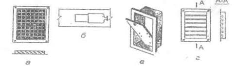 а - решітка з рухомими жалюзями; б - отвір з рухомим регулюючим шибером; в - отвір з "хлопавкою"; г - решітка для перетікання повітря
