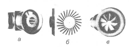 а - дисковий без регулювання витрати повітря; б - дисковий з регулюванням витрати повітря; в - дисковий для роботи в вологих та агресивних повітряних середовищах