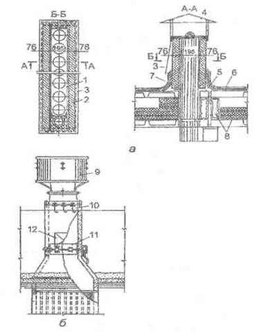 а - з окремими каналами; б - з об'єднаними каналами; 1 - залізобетонно вентиляційна блок-панель; 2 - утеплювач каркаса з цементно-фібролітових плит; 3 ~ обшивка із оцинкованої покрівельної сталі; 4 - металевий зоні типу Т; 5- цементний або асфальтовий бортик; 6-гідроізоляційний килим з руберойду; 7 - поверхнева закріпна гравійно-бітумна засипка; 8 - панель; 9 дефлектор типу ЦАП; 10 - анкерні болти для кріплення дефлектора; 11 -регулюючий дросель-клапан; 12 - оглядовий люк