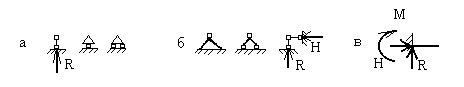С технической точки зрения опорные закрепления конструкций весьма разнообразны. При формировании расчетной схемы все многообразие существующих опорных устройств схематизируется в виде ряда основных типов опор, из которых наиболее часто встречаются: шарнирно-подвижная опора (возможные обозначения для нее представлены на рис.3,а), шарнирно-неподвижная опора (рис.3,б) и жесткое защемление, или заделка (рис.3,в).