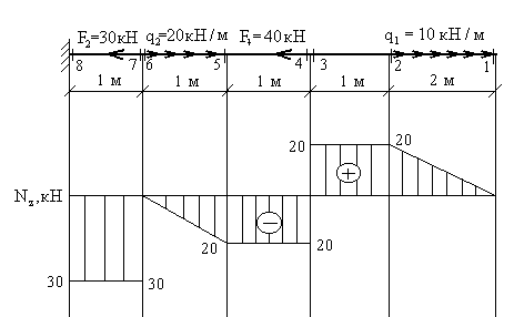 : условимся считать продольную силу в сечении положительной, если внешняя нагрузка, приложенная к рассматриваемой отсеченной части стержня, вызывает растяжение и отрицательной - в противном случае.