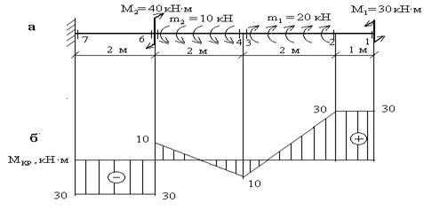 Пример 2. Построить эпюру крутящих моментов для жестко защемленного стержня (рис.5,а).