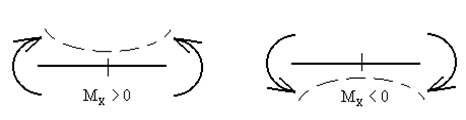 : условимся считать изгибающий момент в сечении положительным, если внешняя нагрузка, приложенная к рассматриваемой отсеченной части, приводит к растяжению в данном сечении нижних волокон балки и отрицательной - в противном случае.