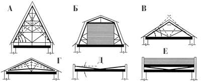 Простейшей скатной является односкатная крыша (рис. 3А). Чаще всего она используется на вспомогательных зданиях, сооружениях простой конструкции, производственных или складских корпусах. Скат крыши, как правило, обращают к наветренной стороне, защищая тем самым здание от ветра, дождя и снега.