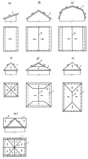 Рис3 .Формы и основные элементы крыши: А - односкатная; Б - двускатная; В - мансардная; Г - шатровая; Д - полувальмовая; - вальмовая; Ж - многощипцовая. 1 - скат крыши; 2 - конек; 3 - ребро; 4 - ендова.