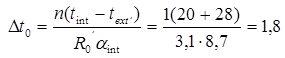 ∆tn - нормируемый температурный перепад между температурой внутреннего воздуха tint и температурой внутренней поверхности ограждающей конструкции, принимаемый по СНиП 23-02-2003. Для наружных стен ∆tn =4.