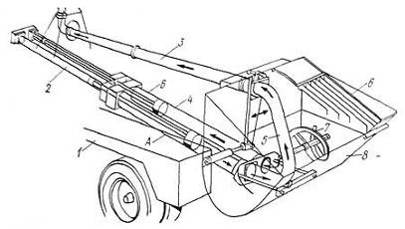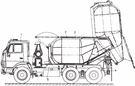 Авто6етоновоз (рис.9) смонтирован на базе шасси 1 автомобиля и оборудован кузовом 3 полезной вместимостью 4 м3. Кузов наклоняется назад при разгрузке относительно опорной рамы 5 на угол до 90° двумя телескопическими гидроцилиндрами. Для обеспечения устойчивости автобетоновоза при подъеме кузова и разгрузки заднего моста шасси машины оборудована двумя гидродомкратами 4. Гидроцилиндры и гидродомкраты работают от гидросистемы базового шасси. Кузов сужен к разгрузочному отвсрстию, расположенному выше уровня транспортируемой смеси, что практически исключает потери смесив пути. Для полной выгрузки смеси без применения ручного труда кузов снабжен встроенным вибратором с гидравлическим приводом, встряхивающим кузов в любых положениях в процессе подъема и опускания.