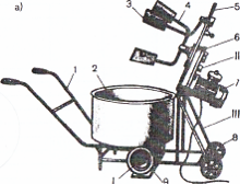 В комплект растворосмесителя входят две сменные чаши-тачки, которые попеременно используются в качестве барабана-смесителя и ёмкости готового раствора. на месте укладки. Техническая производительность смесителя 1,2.1,5 мз /ч, продолжительность цикла перемешивания 1,5.2 мин.