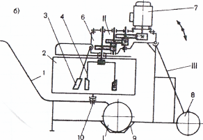 Растворосмеситель с вертикальным лопастным валом рис.7 с объемом готового замеса 65 л имеет три основных узла: чащу-тачку I, представляющую собой цилиндрическую чашу 2, смонтированную на тачке 1, откидывающийся смеситель II. состоящий и3 вертикального лопастного вала 4, фланцевого электродвигателя 7 на напряжение 220/380 В, с частотой 50 гц, трехступенчатого цилиндрического редуктора б, неподвижной лопасти 3 и ограждения 5, тележку, имеющую обрезиненные колеса 8, фиксаторы-ловушки 9 для установки чаши-тачки 1 и шкаф электрооборудования. При вращении по часовой стрелке лопастного вала, смещенного относительно центра чаши, движущаяся смесь увлекает за собой чашу, вращающуюся вокруг своей оси против часовой стрелки в опоре 10. Частота вращения чаши регулируется отклонением не подвижной лопасти 3, шарнирно соединенной с корпусом редуктора привода. Эта лопасть создает нужное направление потоков смеси и способствует лучшему перемешиванию компонентов.