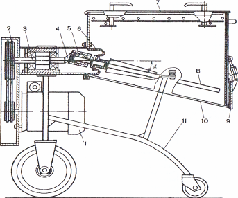 Привод шарнирно подвешен к раме одноосной тележки II, что позволяет поднимать, лопастной вал по окончании цикла перемешивания и перемещать чашу с готовым замесом на тачке. При подъеме привода Он автоматически отключается. Рабочее положение лопастей фиксируется специальным упором.
