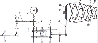 Рис.13 Роторно-шланговый бетононасос: два обрезиненных ролика 3 ротора 4 прокатываются по участку эластичного шланга 1, заключенному в полукольцевой насосной камере 2, и выдавливают из него бстонную смесь в напорный рукав 5, соединенный с бетоноводом 6. Во всасывающем рукаве 9 за счет упругого восстановления формы шлагом создается разряжение,, необходимое для засасывания бетонной смеси из приемного бункера 7 с лопастным смесителем 8, непрерывно перемешивающим смесь.