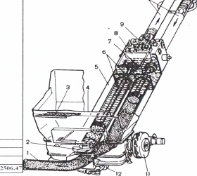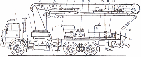 На раме автобетононасоса смонтированы гидробак 6, бак для воды 10 и компрессор 12. Стрела монтируется на поворотной колонне 3. опирающейся на раму 1.5 шасси 1 через опорно-поворотное устройство 2, поворачивается в плане на 360° гидравлическим поворотным механизмом и имеет радиус действия до 19 м.
