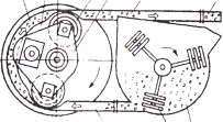 Пневматические прикрепляемые вибраторы выполнены по единой конструктивной схеме и состоят из планетарного возбудителя и гибкого резинового шланга спусковым краном, подсоединяемого к источнику сжатого воздуха - компрессору или внешней воздухопроводной линии. Основными элементами планетарно-фрикционного вибровозбудителя (рис. 19) являются статор 4 с одной текстолитовой лопаткой 5, закрепленный неподвижно в боковых щитах корпуса 1, и полый неуравновешенный относительно собственной оси ротор 3. Ротор выполняет роль бегунка-дебаланса и планетарно обкатывается вокруг статора. Лопатка, помещенная в продольном пазу статора, разделяет пространство между статором и ротором на две полости рабочую А и выхлопную Б. Сжатый воздух, поступающий в рабочую полость через отверстие в статоре, приводит во вращение ротор, который планетарно обкатывается по цилиндрической поверхности статора, прижимаясь к ней под действием центробежной силы.