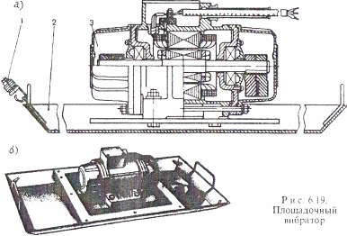 Площадочный вибратор (рис.18) передает колебания уложенной массе бетона через корытообразную прямоугольную в плане металлическую площадку 2, к которой болтами жестко прикреплен мотор-вибратор. При работе площадочный вибратор уплотняет отдельные участки заранее распределенного слоя бетонной смеси.
