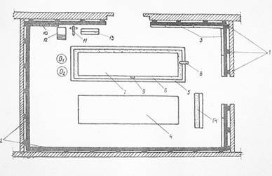 О1 , О2 – рабочие места облицовщиков; 1-бруски черного каркаса; 2-бруски чистого каркаса; 3-древеностружечные плиты, наживленные к каркасу; 4-штабель нарезанных маркированных плит; 5-стол; 6-полотнище текстовинита; 7-плита, обтягиваемая текстовинитом; 8-струбцина; 9-брусок-подкладка для изгиба плит; 10-установленная плита, обтянутая текстовинитом; 11-дощатый рычаг; 12-лестница-стремянка; 13-ящик с инструментами; 14-рулон текстовинита.