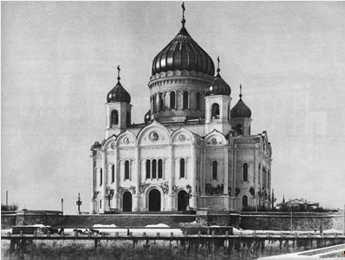 Но, в то же время, в композиции храма проступают и характерные признаки классицизма: массивный кубовидный объем, относительная грузность пропорций. В особенностях пятиглавия - купол на широком барабане и относительно небольшие боковые клавы-колоколенки - легко распознаются конкретные прототипы, в частности, Исаакиевский собор в Петербурге. Тон сознательно ориентируется на некоторые особенности Исаакиевского собора. Храм Христа Спасителя претендует не только на роль новой, соизмеримой по значению с кремлевскими соборами, святыни. Своей архитектурой он пытается встать вровень с Исаакиевским собором в Петербурге. Этот собор своими размерами, местоположением, значением (в день празднования св. Исаакия Далматского родился Петр I) превращался в символ новой европеизированной России - детища Петра I. Храм Христа Спасителя становится антиподом Исаакиевского собора. Он символизирует иную концепцию российской истории, связанную в своих истоках с древней Русью и Византией.