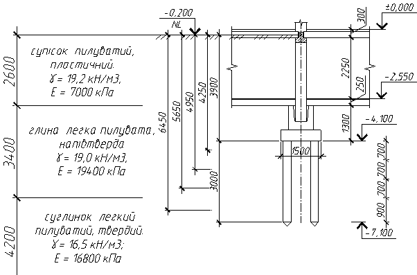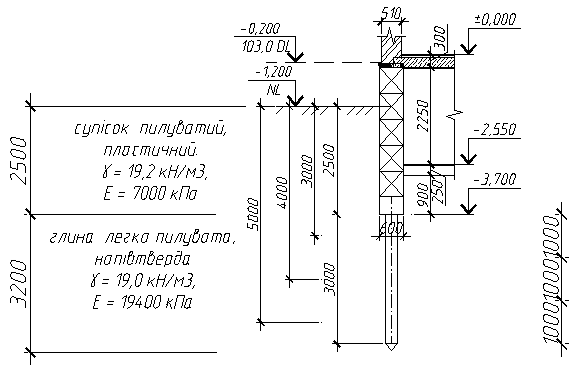 Залізобетонна паля заглиблена в шар №30 - суглинок легкий пилуватий, твердий. Приймаємо палю марки С3 - 300 (довжина l = 3 м, переріз b х h =300 х 300 мм ). Бетон B20 , поздовжня арматура класу - 4Ø10 А400C.