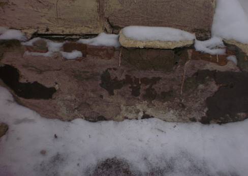 Разрушению цокольной части здания способствует малый вылет карнизной части кровли, из-за чего влага попадает на стены цоколя и происходит из замораживание и оттаивание, разрушающее наружную часть стен. При организованном водоотводе с кровли важно надежное устройство мест водосброса из труб ливневой канализации с тем, чтобы исключить попадание влаги на цоколь.