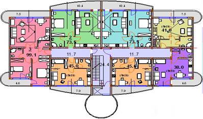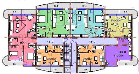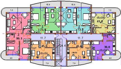 - квартири з 2 спальнями площею 99.1 м2 – 4 квартири.