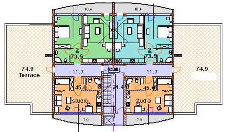 - квартири з 1 спальнею площею 73.5 м2 – 10 квартир;
