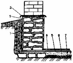 Застосування гідроізоляції: 1, 7 – глина; 2 – цементна штукатурка покрита бітумом з зовнішньої сторони; 8, 5 – гідроізоляція; 4 – цементна підлога; 6 – бетонна стяжка.