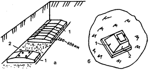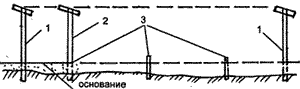Якщо грунти піщані, фундаментні блоки укладаються безпосередньо на вирівняну підставу, при інших видах грунту - влаштовується піщана подушка завтовшки 10м. Грунт під підошвою фундаменту не може бути не насипним, не розпушеним, якщо такий є, його необхідно видалити, а взамен насипати щебінь і пісок, після чого ретельно утрамбувати. Ямки в підставі заповнюються бетоном. Для визначення горизонтальності підстави, відведеної під фундамент, на початку і в кінці ставлять контрольні нерухомі визирки 1, аби верх визирки був вищий за відмітку підстави на довжину переносної ходової перевірочної визирки 2. Рівень контрольних визирок перевіряють щодня за допомогою нівеліра або після обноска. Між визирками 1 забивають в підставу кілочки 3, на яких ставиться ходова перевірочна визирка.