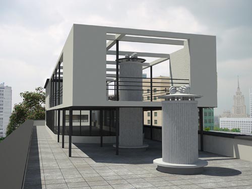 В отличии от традиционного выставочного пространства с плоским подвесным потолком и однородным искусственным освещением мы использовали плавные линии сводов, оболочек, а также наклонные перекрытия. Благодаря этому облегчается устройство фонарей верхнего света, обеспечивается разнонапряженная световая среда.