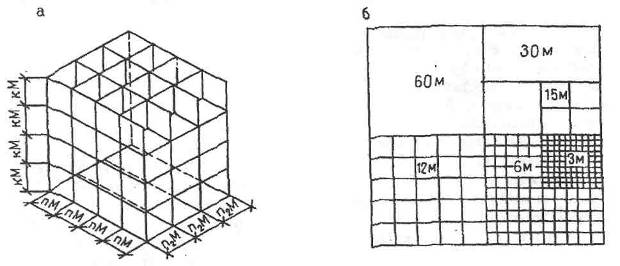 а - пространственная система модульных плоскостей; б - взаимосвязь укрупненных модулей в плоскости