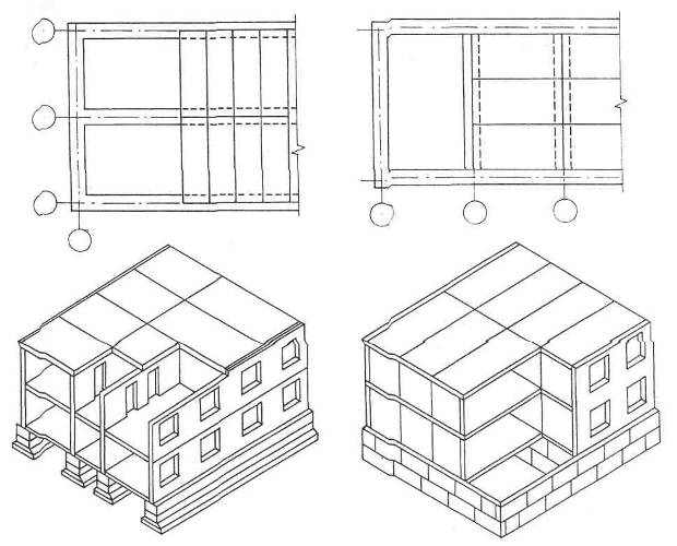 Совокупность таких элементов как фундаменты, стены отдельные опоры перекрытия носит название несущего остова здания. В зависимости от вида несущего остова различают основные конструктивные схемы зданий: