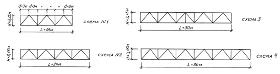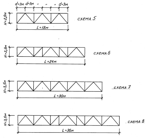 Уніфіковані геометричні схеми ферм для різних прольотів і форм поперечних перерізів стержнів наведені на рис.1.1.