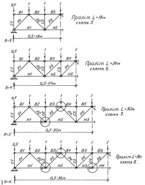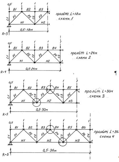 У відповідності з вказаними у завданні на проектування прольотом ферми L і типом поперечного перерізу стержнів, необхідно обрати відповідну геометричну схему за рис.1.1 і навести її у пояснювальній записці до курсового проекту.