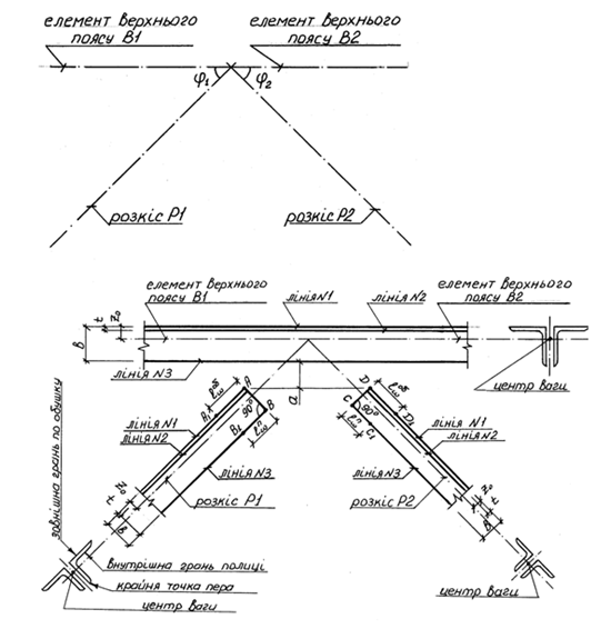 Розглянемо розрахунок і конструювання другого зліва вузла верхнього поясу, у якому сходяться стержні В1, В2, Р1 і Р2 (див. рис 3.1). Побудову вузла на кресленні починають з нанесення осьових штрих-пунктирних ліній, що співпадають з центрами ваги перерізу, (рис.5.5). Вони повинні перетинатися в однієї точці – центрі вузла.
