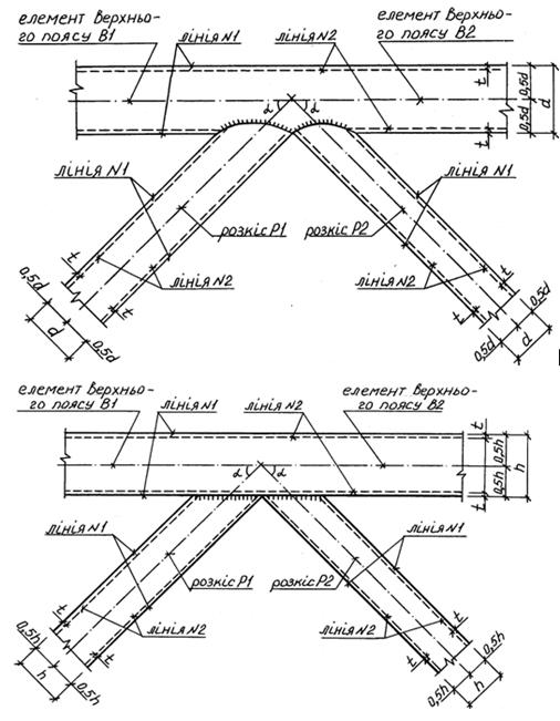 Проектування ферми треба починати з розробки геометричної схеми. Її утворюють осьові лінії, які проходять через центри ваги стержнів. Осьові лінії усіх стержнів, що сходяться у вузлі, повинні пересікатись в однієї точці – центрі вузла.